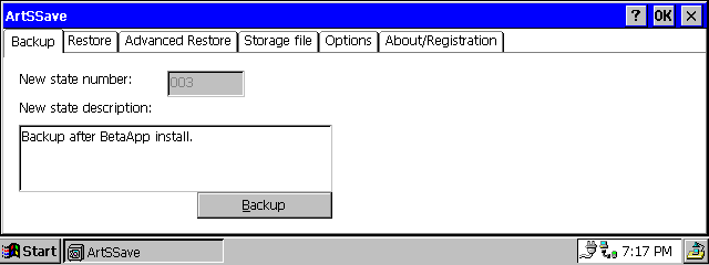 Опять же следуя рекомендациям справки к ArtSSave, мы всегда производим резерное копирование после установки сомнительных приложений. Вводим комментарий и нажимаем кнопку Backup. Новое состояние устройства будет сохранено под именем State 3.