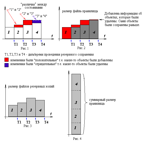На рис.1 показаны "состояния" устройства в моменты времени 1, 2, 3 и 4. В эти же моменты времени были сделаны резервные копии данных содержащихся в устройстве. На рис.2 показан размер хранилища резервных копий соответственно в моменты времени 1, 2, 3 и 4. Из рисунка видно, что размер хранилища увеличивается исключительно на величину различий между текущим состоянием устройства и состоянием устройства в момент последнего резервного сохранения. Таким образом не происходит никакого дублирования данных в хранилище, что позволяет существенно сэкономить "дисковое" пространство для сохранения большего количества резервных копий ("состояний") устройства.