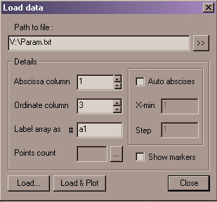You must give array a name (label). The label will be used to specify array in the Graph Plotting window. Array label must start with the # character. ArtSGraph generates names automatically for consequently loaded arrays - #a1, #a2, #a3, etc., however you can change the proposed name.