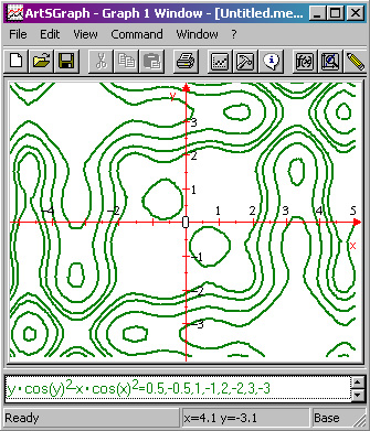 Set of level lines for F(x,y)=y*(cos(x))^2-x*(cos(y))^2. Level values are ±0.5,±1,±2,±3
